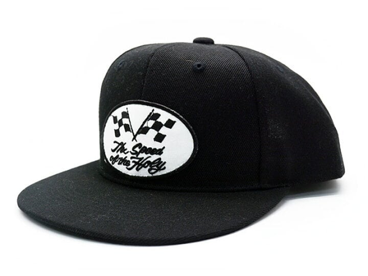 ★チェッカーフラッグの刺繍パッチを施したスナップバッグ仕様の調整可能キャップです。